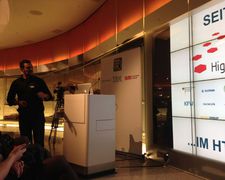 The first speaker therefore stood to the left of the lectern. That didn't work so well for two reasons. First of all, the event was recorded and he was now outside the area that the cameras were set up to capture. He was also very far away from a good portion of the audience now, and was even obscured by the lectern for some of them. After being shooed to the right, he ended up mostly standing behind the lectern, with occasional forays further right to point out things on his slides.